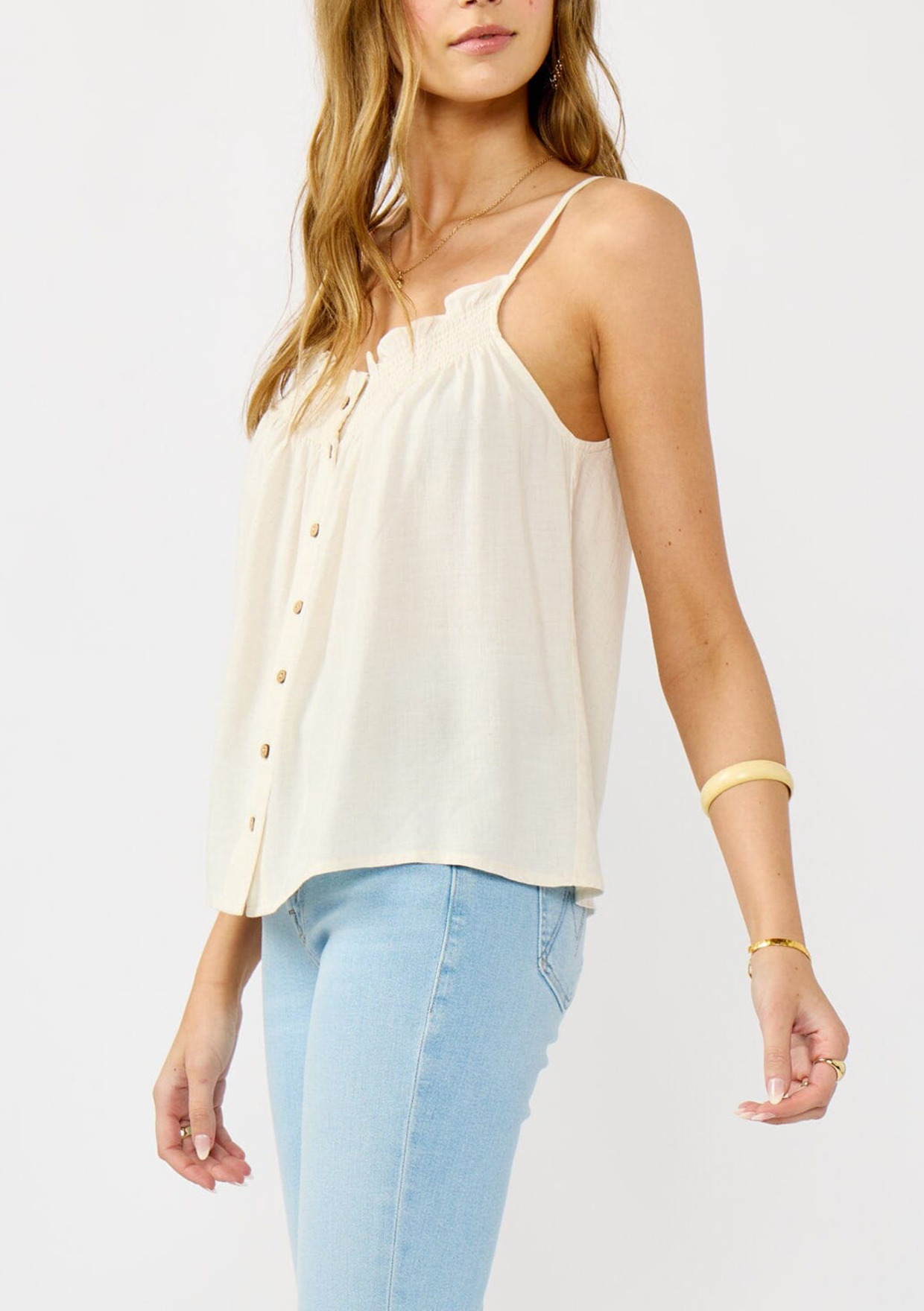 A super-flowy boho camisole that captures the essence of free-spirited style. This warm weather essential features chic smocked detailing and a button front, adding a playful twist to your average cami. Perfect for effortless, laid-back looks all summer long.