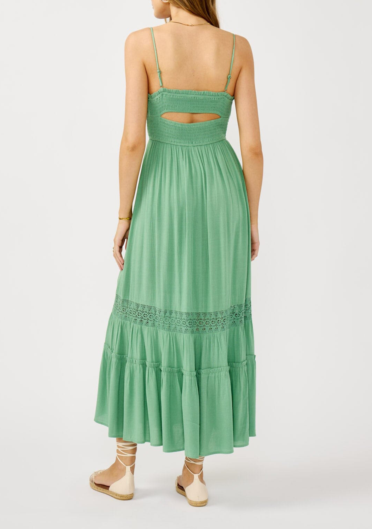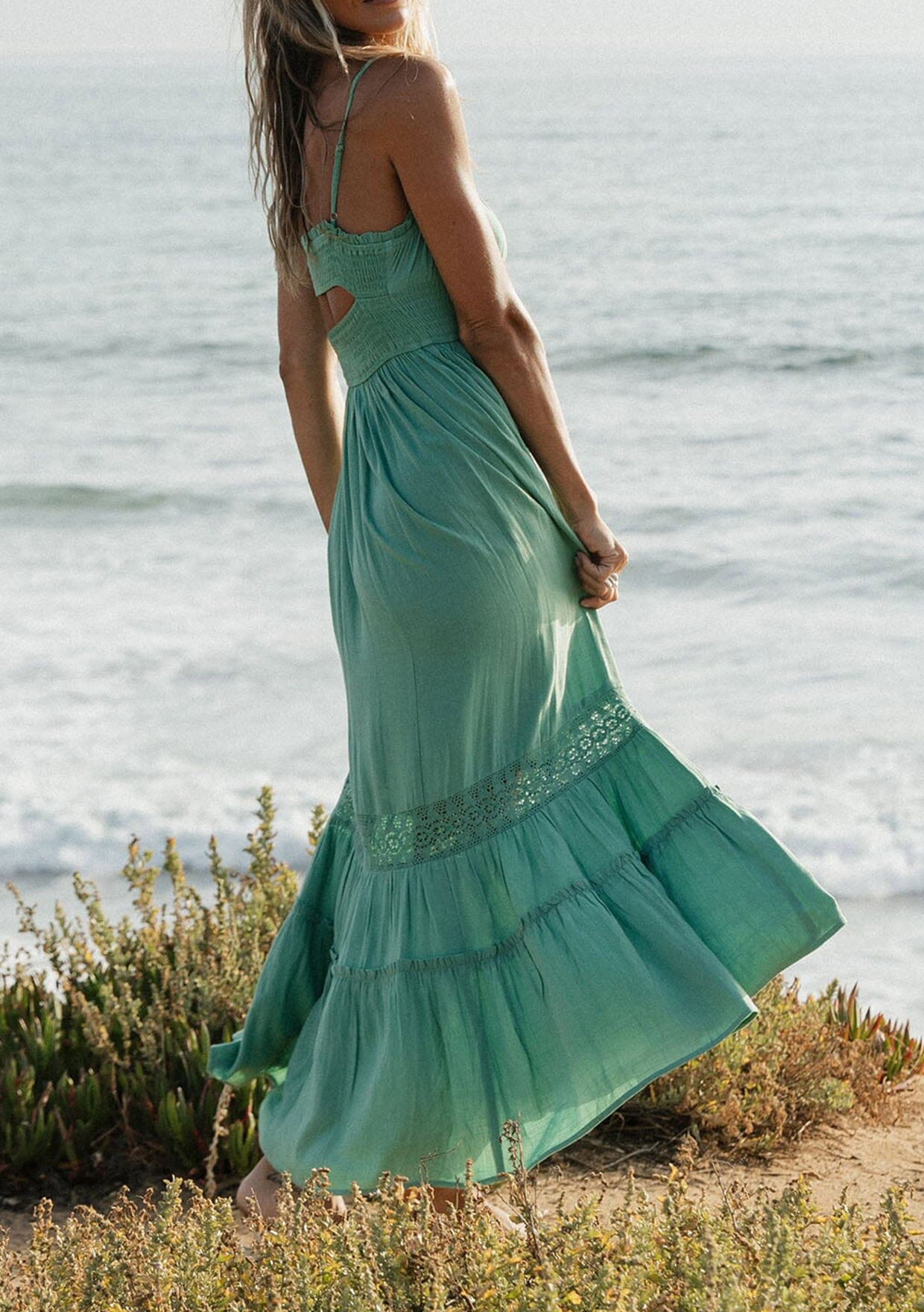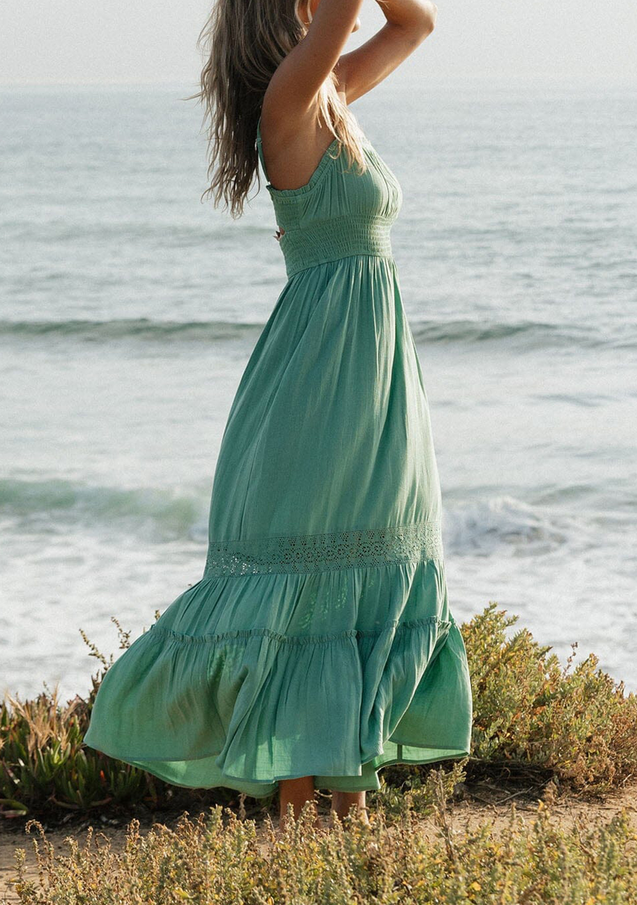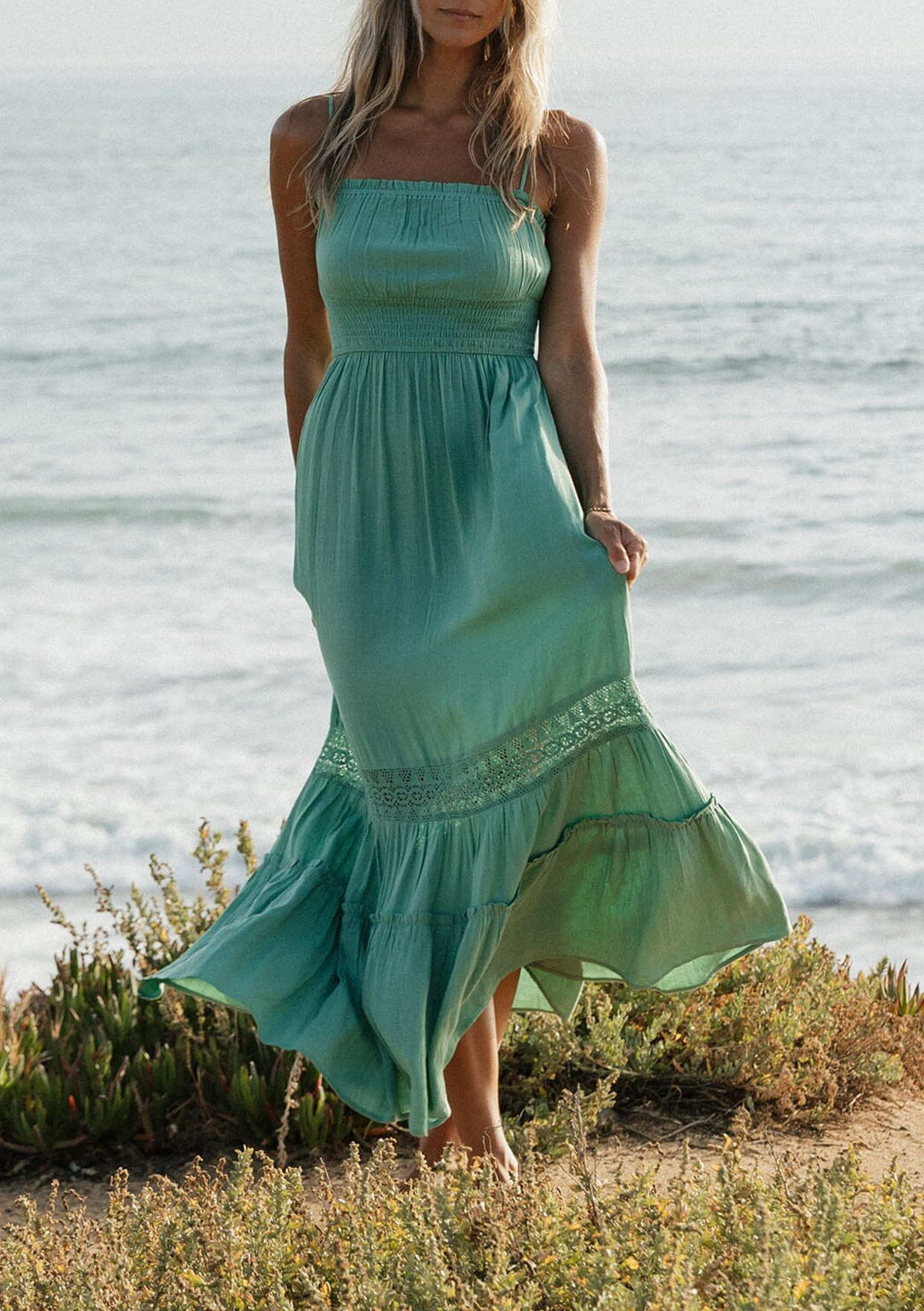 A summer staple loved for its effortless, vacation-ready vibe. This dreamy boho maxi is made for sun-filled days and breezy nights. Featuring a smocked empire waist, adjustable spaghetti straps, and a flowy skirt with delicate lace accents. The perfect versatile piece to round out any warm-weather wardrobe.