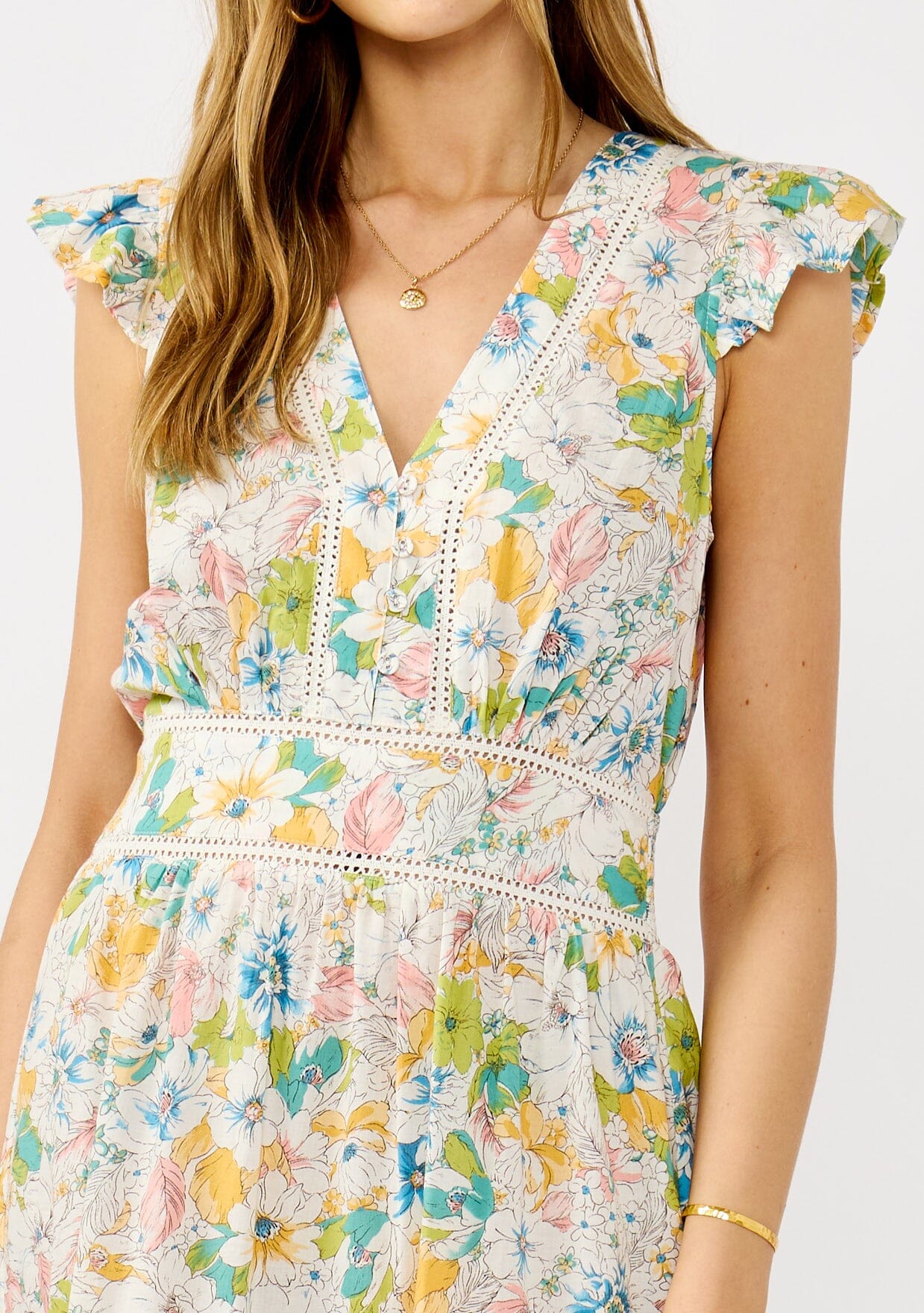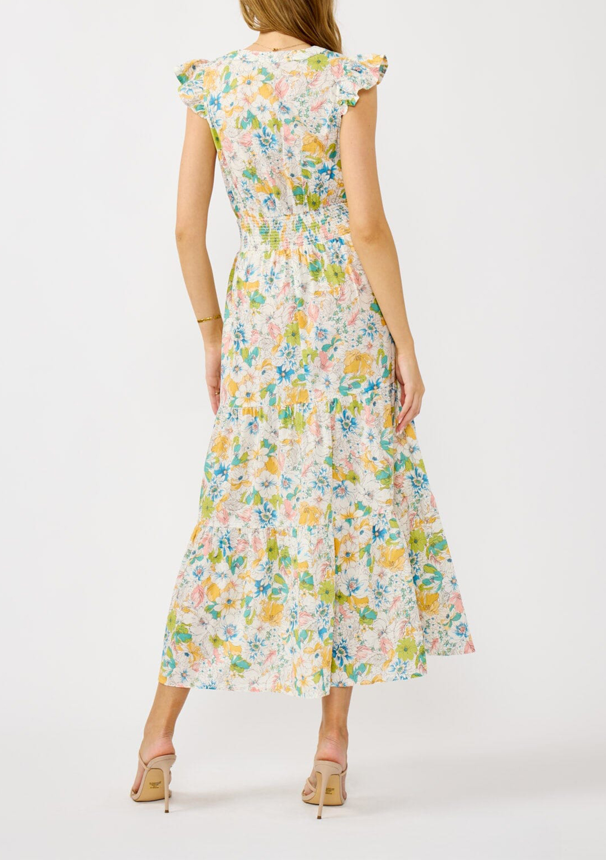 Romantic lace details and a dreamy floral print come together in this effortlessly boho maxi dress. Featuring flutter cap sleeves, a v-neckline, and a tiered, flowy skirt that moves gracefully. Whether dressed up with heels or styled casually with flats, its vibrant summer colors and feminine silhouette are sure to make a lasting impression.