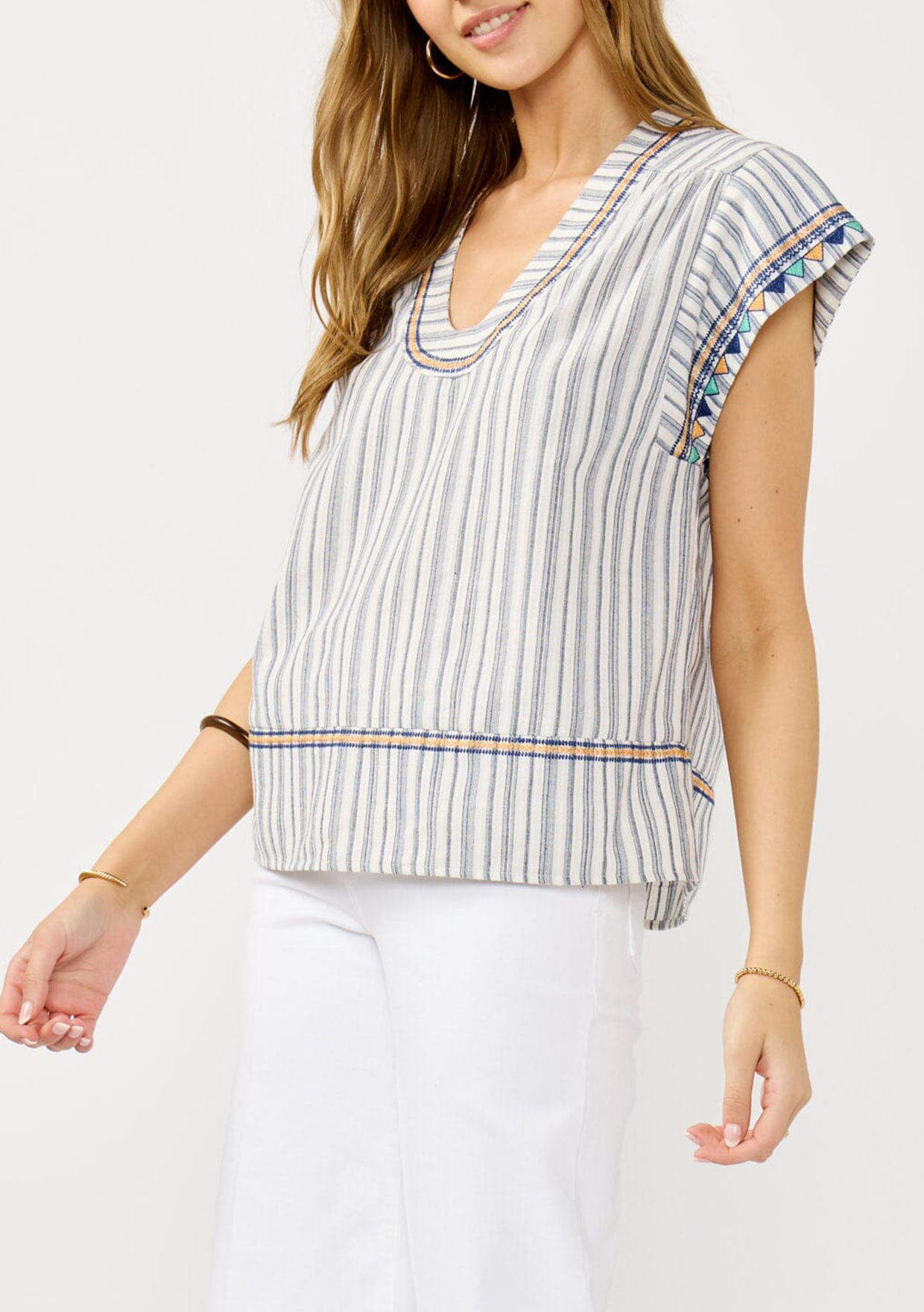 Easygoing with a hint of boho flair, this laid-back striped top is your new summer go-to. Intricate embroidered accents add a pop of color, while the narrow scoop neckline and relaxed dolman sleeves keep things breezy. Just pair it with your favorite denim for a look that’s effortlessly carefree and sun-ready.