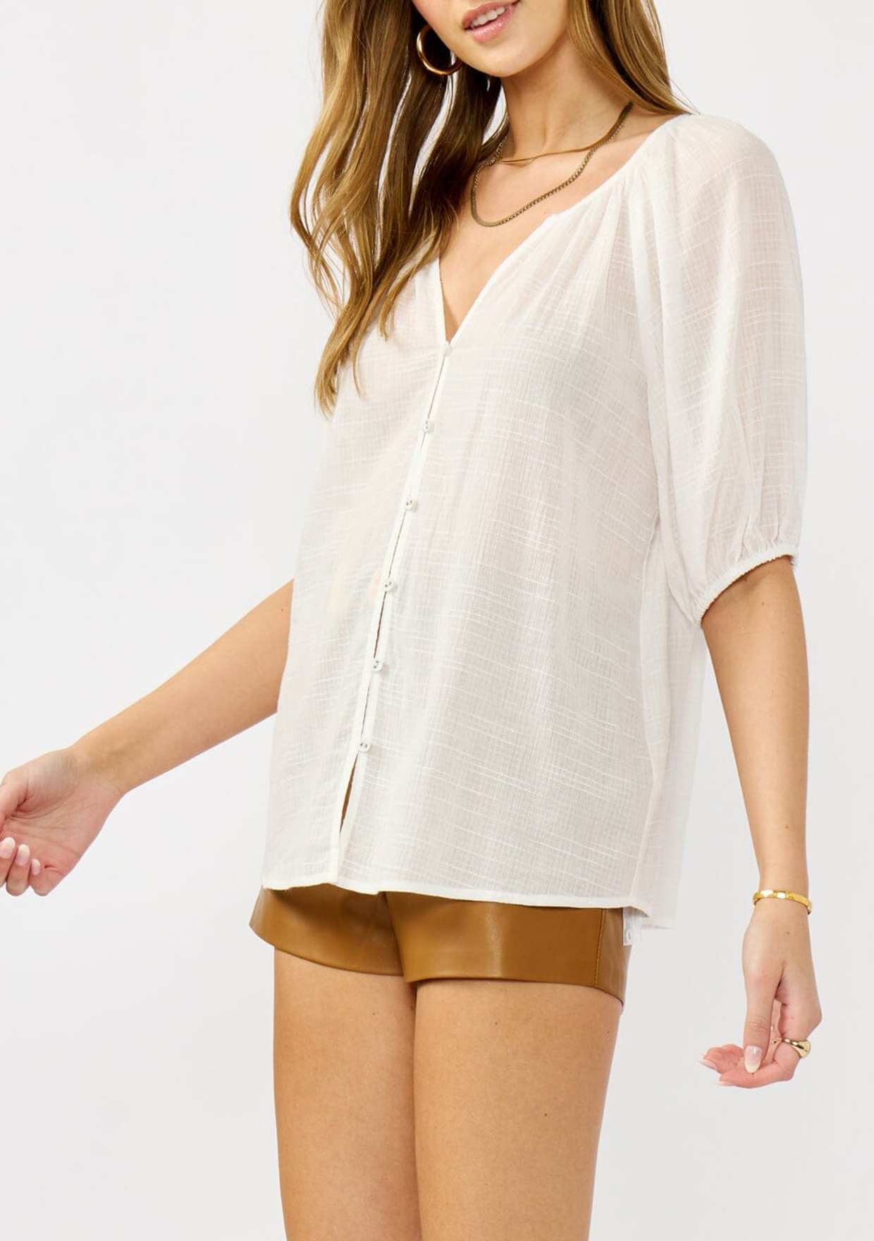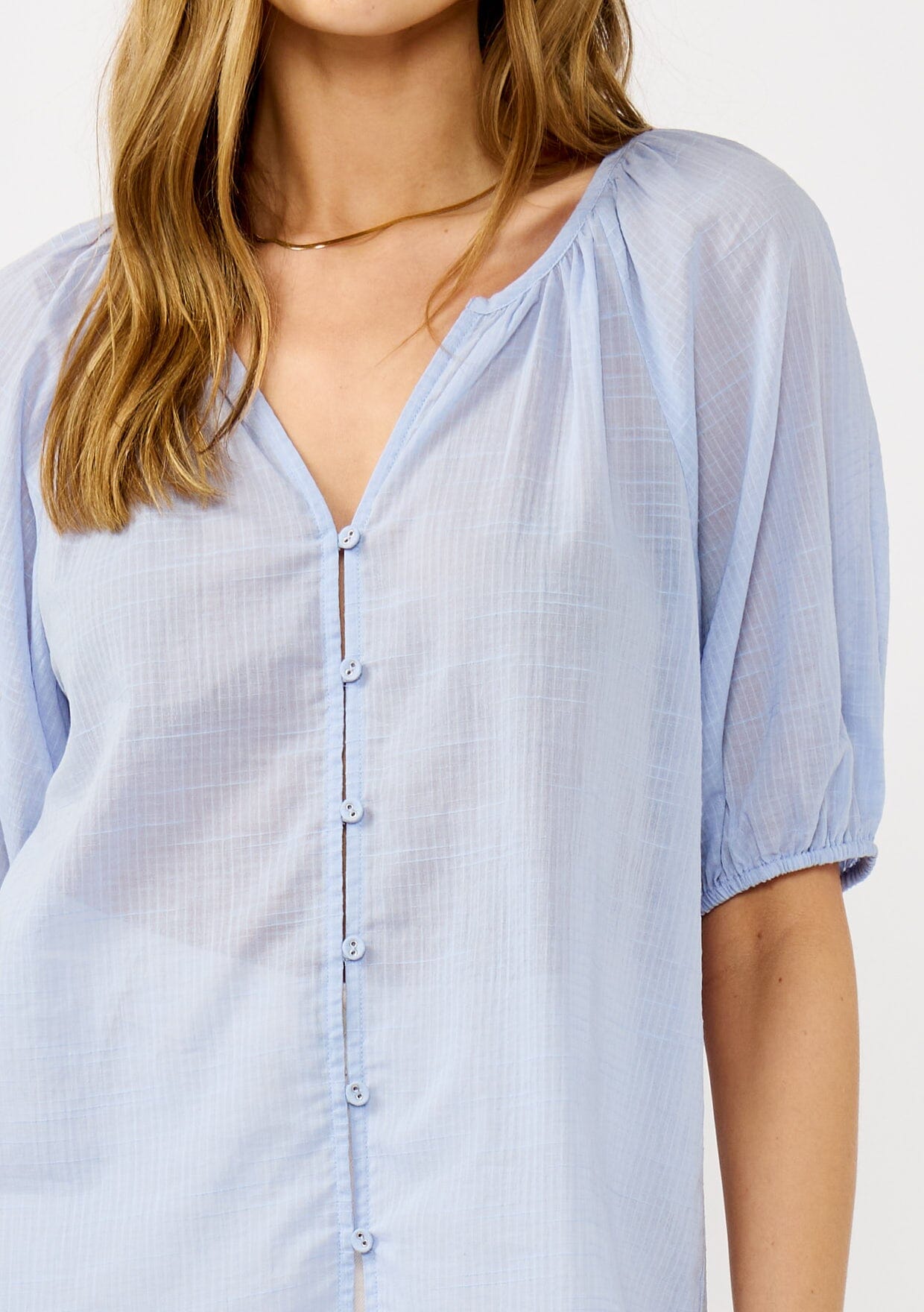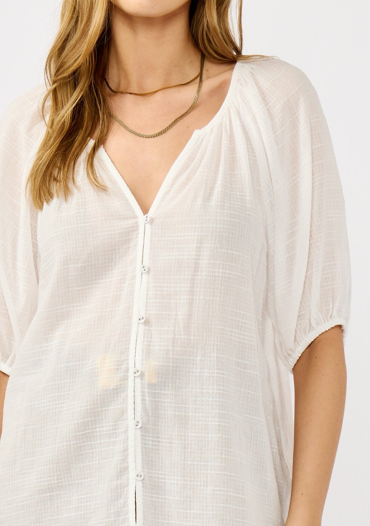 A classic boho puff sleeve top designed for sunny days. Crafted from breezy textured cotton, it features a delicate button front and an easy, relaxed fit. Tuck it into trousers or wear it loose with shorts—this lightweight top is your go-to for effortless warm-weather looks.